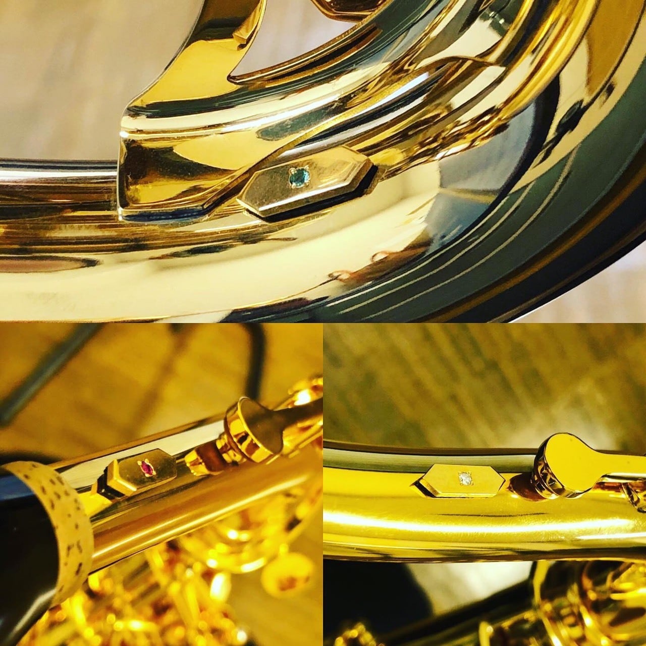 サウンドストーンは宝石の種類によっていつもと違った音や吹奏感が楽しめる楽器ジュエリーです。直付サウンドストーンは両面テープで固定する仕様なので、全ての楽器に取り付けが可能です。口元やロータリー付近など部位によっても程度が違うので、より細かく自身に合った吹奏感を追求する事が可能です。また他の宝石と組合わせると各々の特徴がミックスされるので、音の表現に広がりが生まれます。