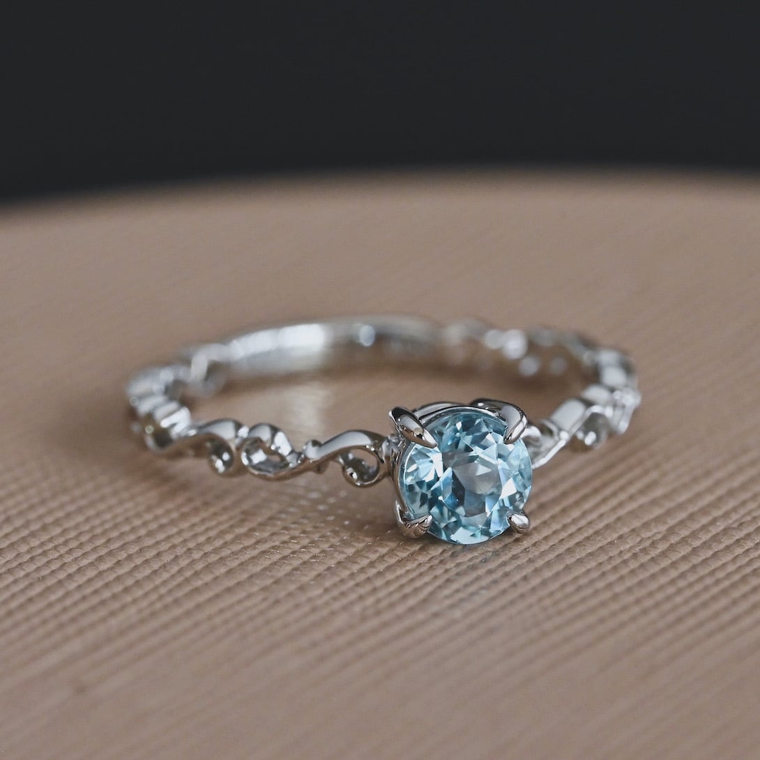 弦楽器"F字孔"モチーフリングに綺麗なアクアマリンを留めた1点ものシリーズ。抜け感のあるアームが、宝石の瑞々しさをより一層引き立たせております。