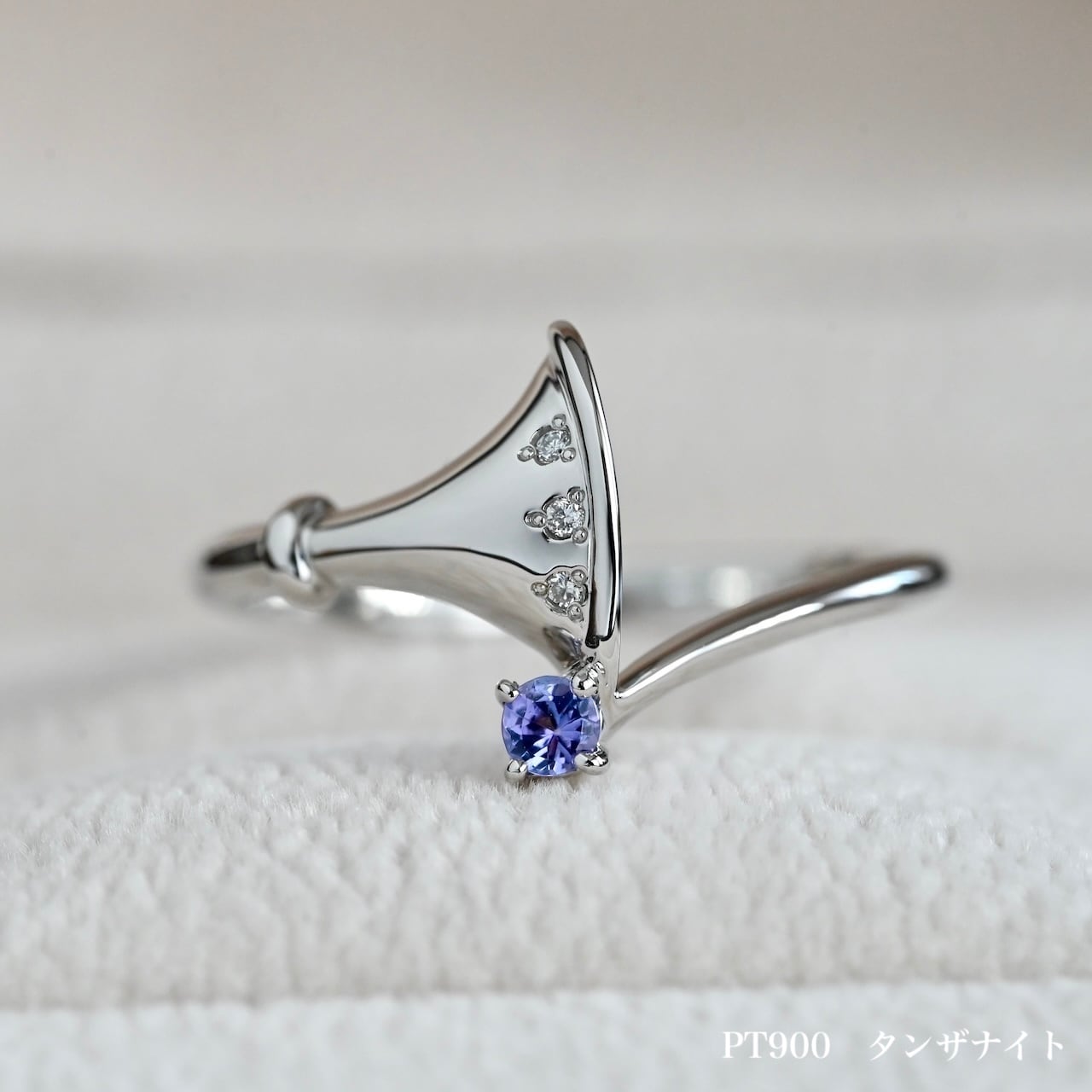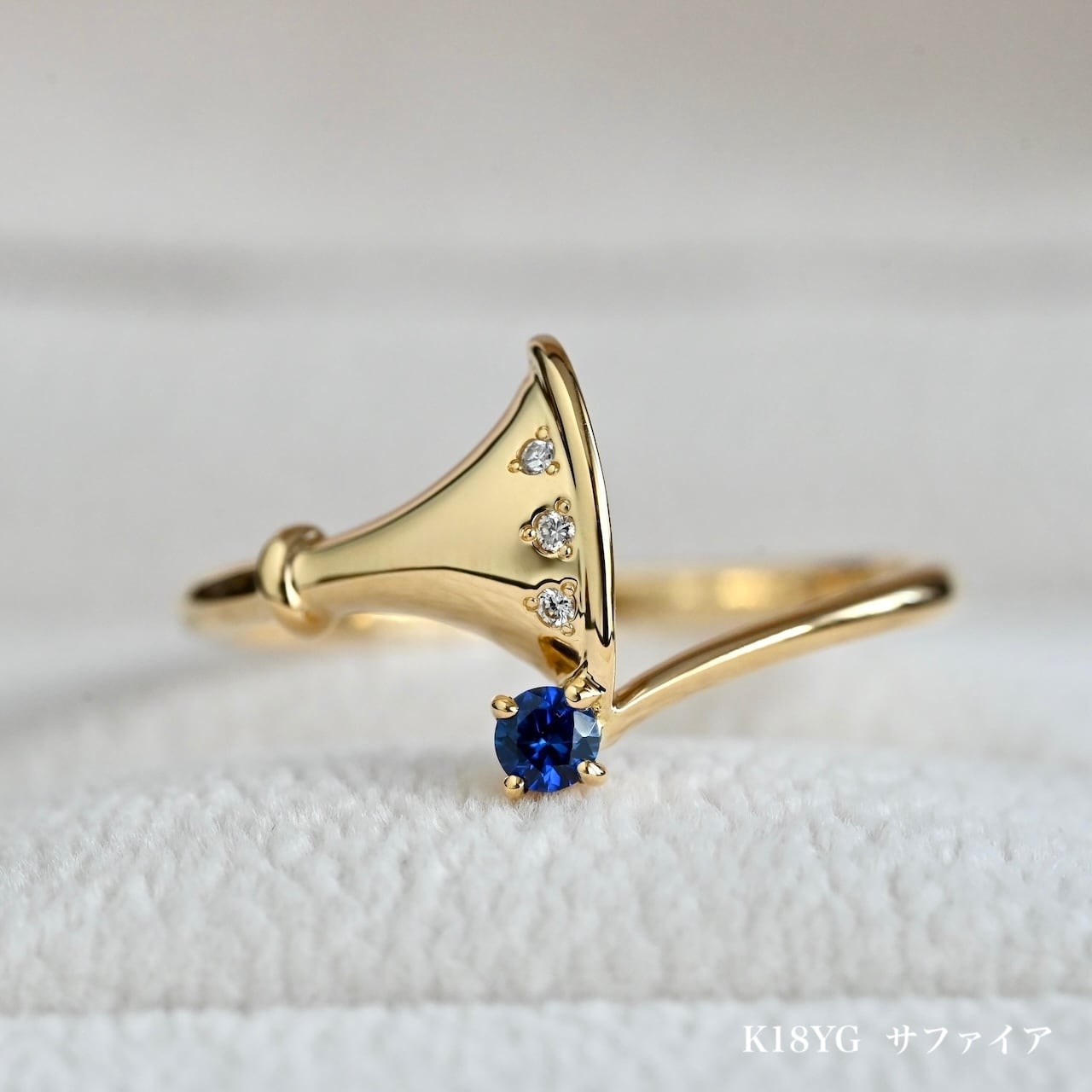 管楽器の「ベル」をモチーフにしたリングです。立体的なフォルムが程よい存在感を放ち、リングコーディネートの主役としてもお楽しみいただけます。遊び心を添えながらも、ジュエリーらしい上質さを感じられるデザインに仕上げました。メインの宝石は誕生石からお選びいただけますので、オリジナリティのある特別な一本をお作りいただけます。
