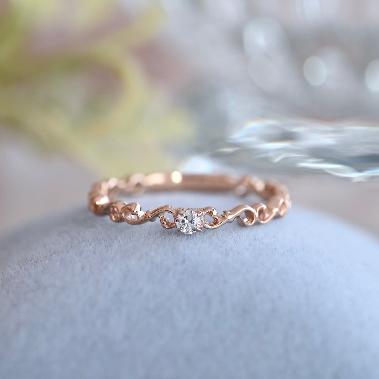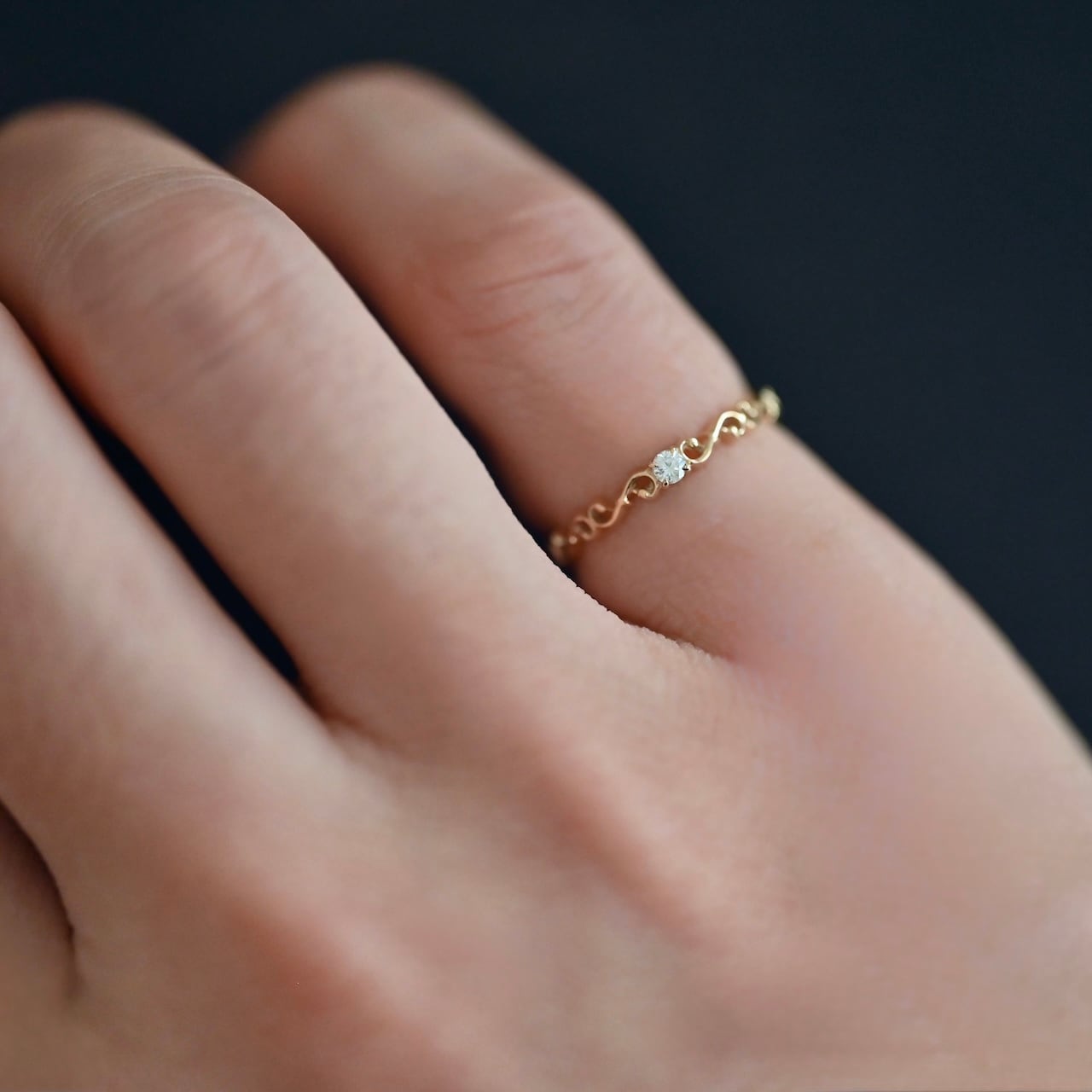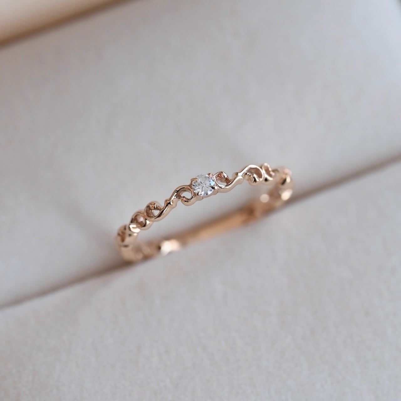 弦楽器の”F字孔”をモチーフにしたピンキーリングです。小ぶりなサイズ感の宝石が日常使いに丁度よく、さりげない輝きが日々を彩ります。後々のサイズ調整にも対応したデザインですので末長くお使いいただけます。