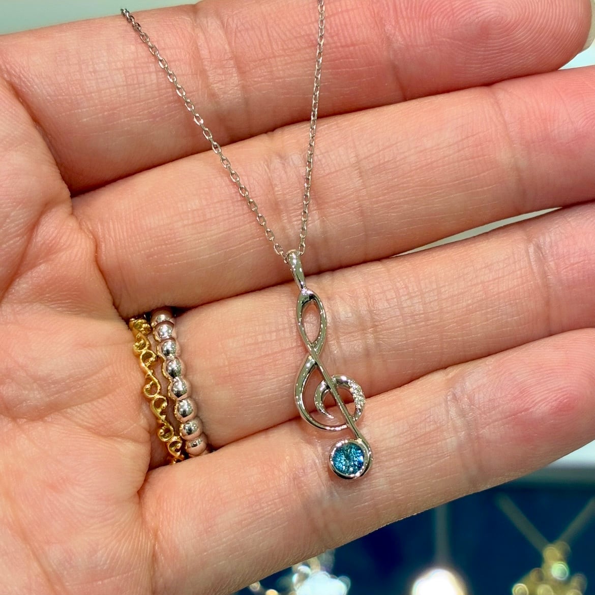 大変珍しく美しいインディゴカラーのサファイアを使用した、一点モノのプラチナ製ト音記号ペンダントトップです。パーソナルカラーがブルベの方や、普段モノトーンコーデやネイビーが多い方に選ばれやすいお色味です。知的さやソフトエレガントな雰囲気があり、年齢を重ねてもお使いいただきやすいお品物です。立体的で美しいフォルムにこだわっており、日常使いしやすいモチーフでありながらも上品な雰囲気を演出します。