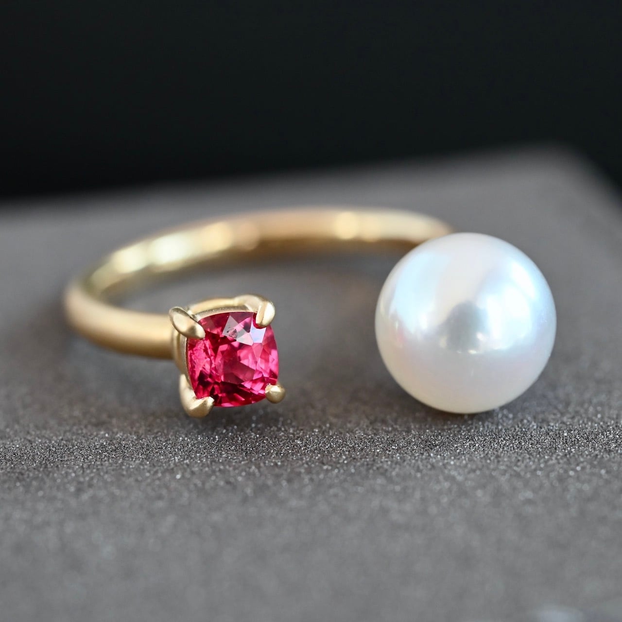 レッドスピネルと8㎜アコヤ真珠を使用したK18YG製のフォークリングです。上質な宝石で日常を彩る一生モノのリングとして、末長くご愛用いただける商品となります。