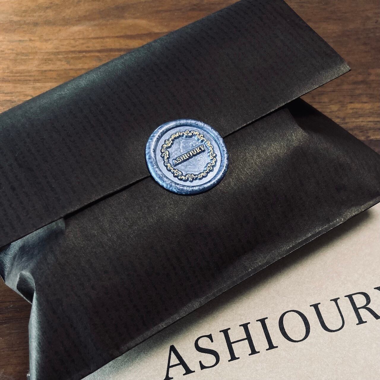 [梱包]:黒の紙箱+包装紙+シーリングスタンプ