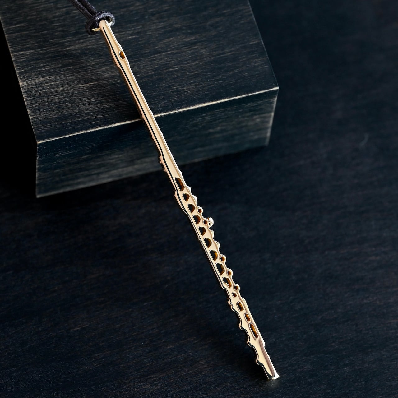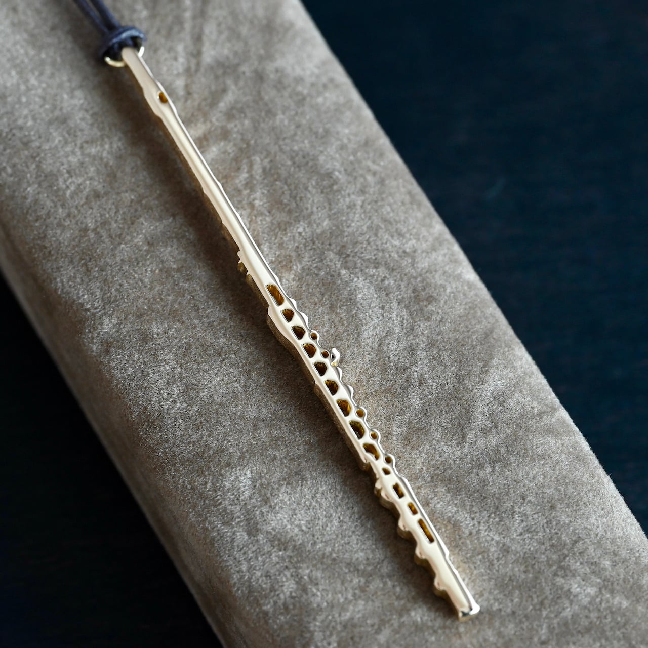 カバンや楽器ケースのアクセントとしてお使いいただけるフルート(L)サイズのバッグチャームです。3㎜厚の真鍮板から一枚一枚切り出して製作しており、細部のパーツまで再現しております。色は真鍮素地、K18ゴールドメッキ、プラチナメッキからお選びいただけ、お好みで誕生石やペンダント仕様にもアレンジ可能です。ご自身用はもちろん、大切な人や特別な日のプレゼントとして喜ばれる商品です。