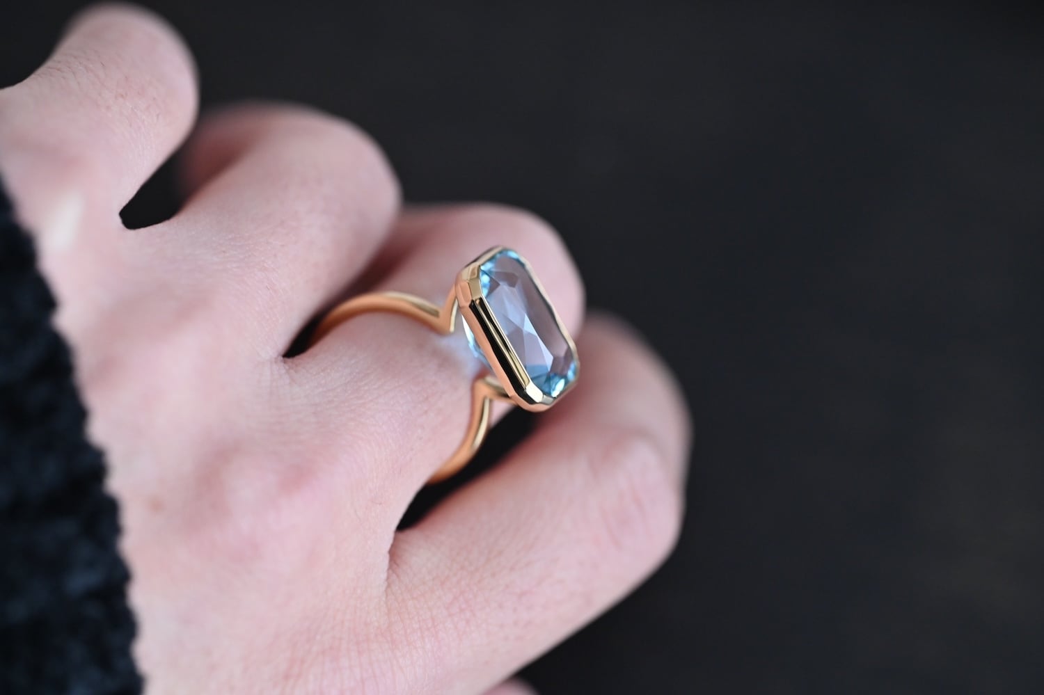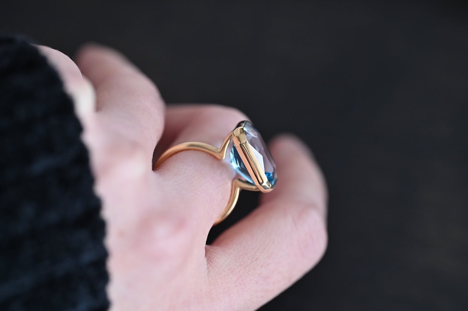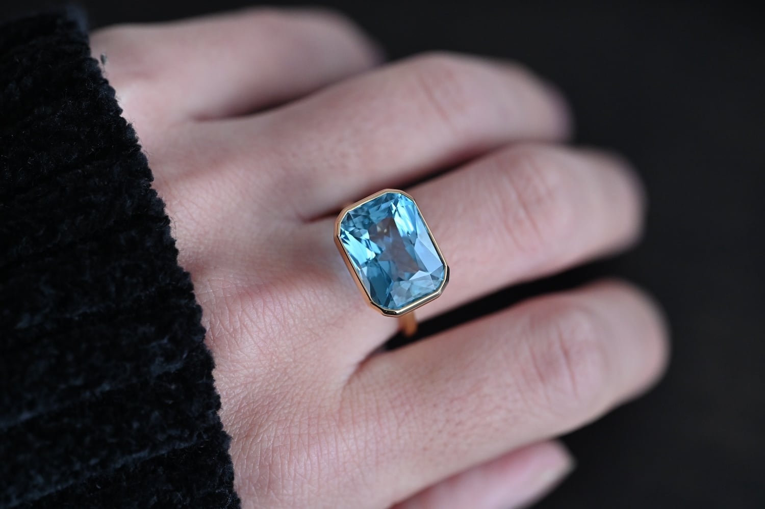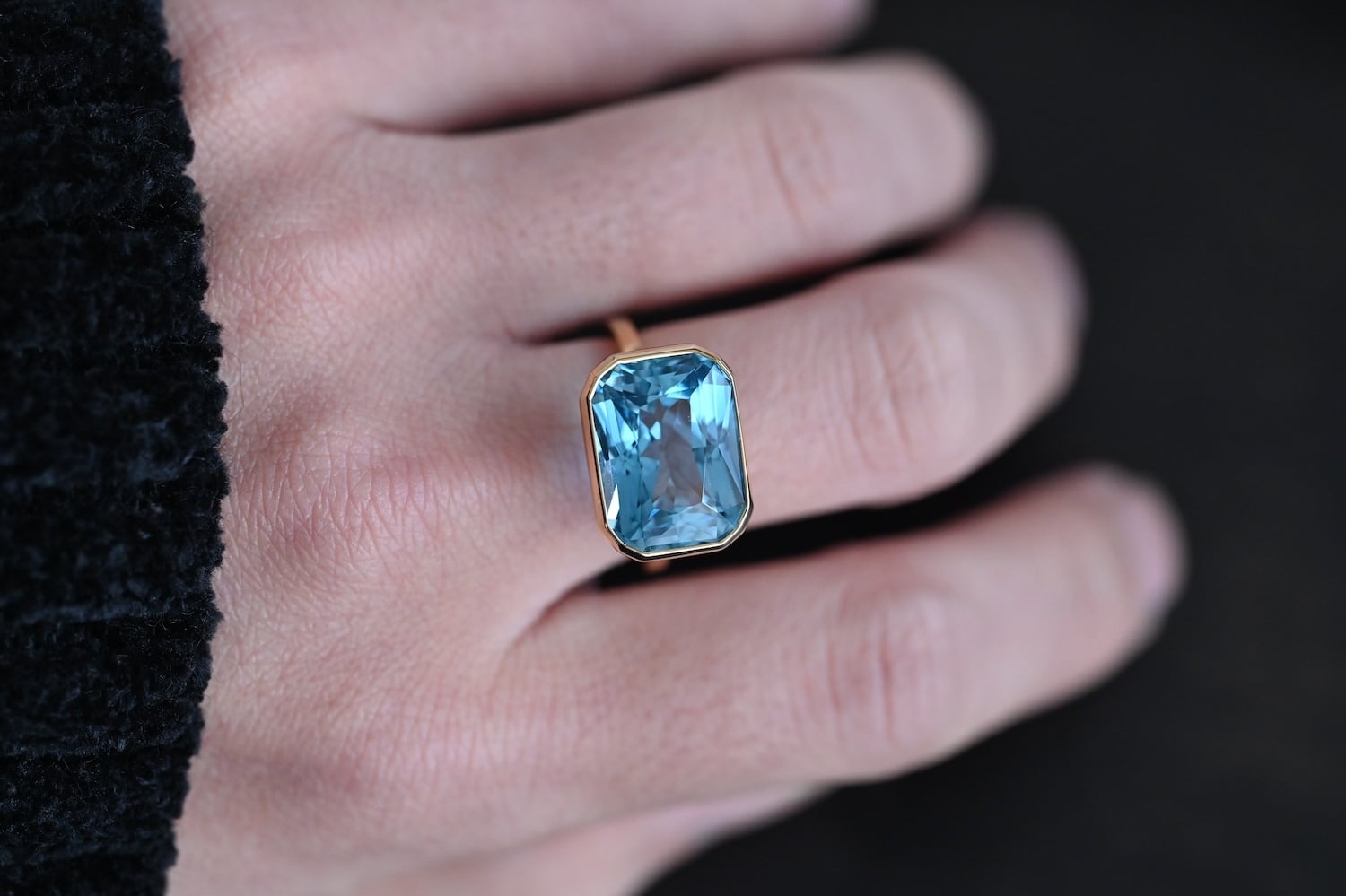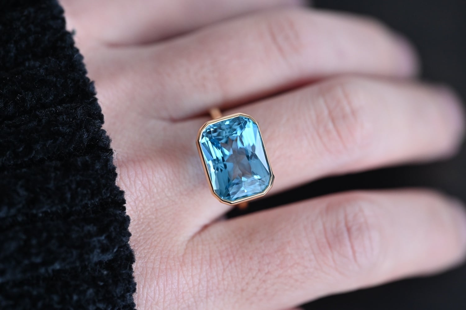 大きめのブルートパーズ(12.95ct)を使用したK18YG製の1点物リングです。宝石下部まで美しく見せるために必要最小限の枠組みで構成しております。上質な宝石で日常を彩る一生モノのリングとして、末長くご愛用いただける商品となります。